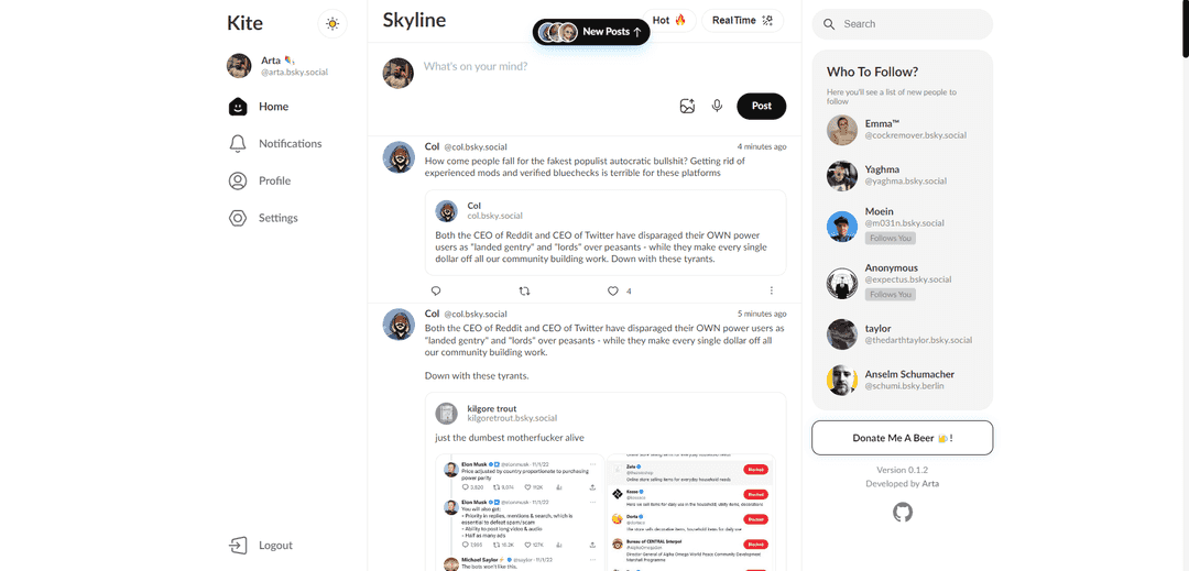 Kite.Black Is An Open Source Web Client Developed Based On Bluesky And ATProto. Developed It Using React.js For Faster Development Speed, Apparantely Because I'm More Fluent In React.js Than Other Web Frameworks. It Has Some Neat Features That The Original Bluesky App And Web Client Are Missing Like Blocks Tab, Likes Tab, Audio Posts, Relevant Follow Suggestions, Keyword Blacklist and etc.